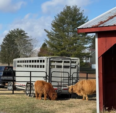 Annye and Rusty finally arrive at Swift Ranch. The fence held, the trailer backed in, and two fluffy Highlands claimed their new home.